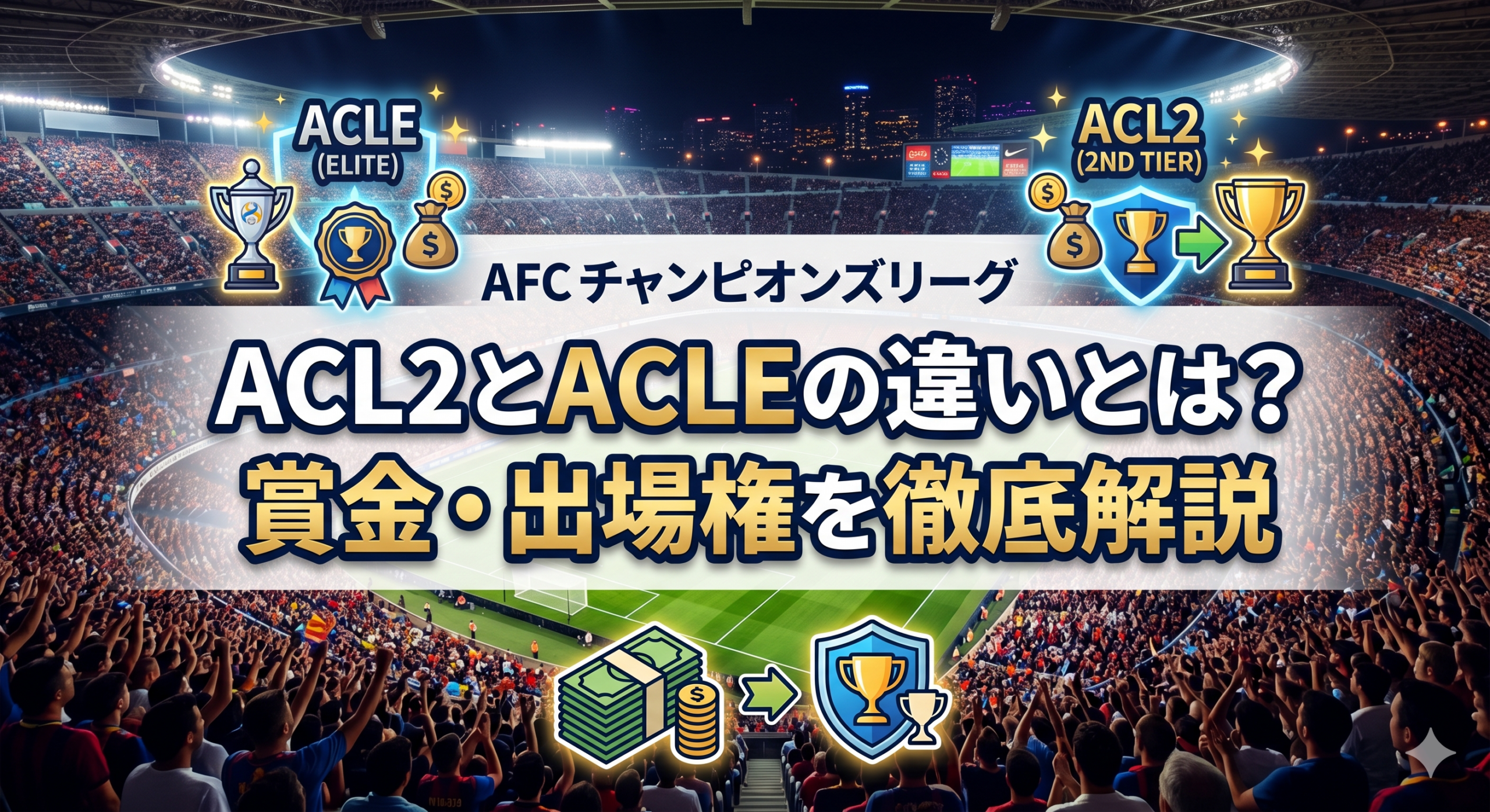 ①ACLEは「アジア第1層」、ACL2は「第2層」。欧州のCL対ELに相当する関係で、大会の格・参加クラブ数・賞金規模すべてに差がある